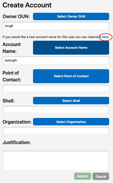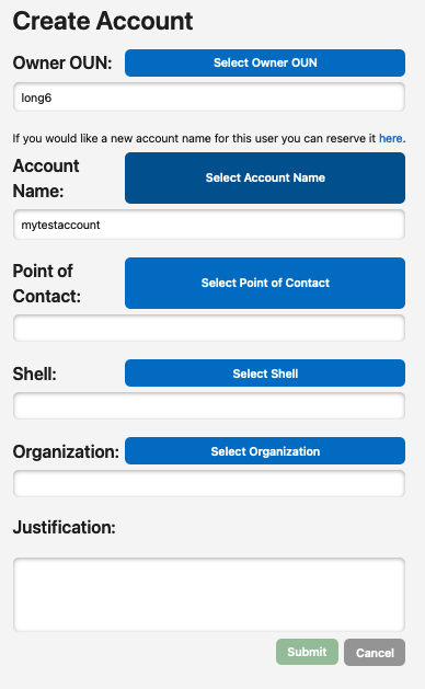 By default, the "Owner" section will be populated with your OUN. If you are creating an account on behalf of another person, use their OUN for the "Owner" field. If this is your first LC account, use your OUN as your Account Name. NOTEIn previous versions of IDM, account names had to be 8 characters or fewer. This is no longer the case in the new IDM.