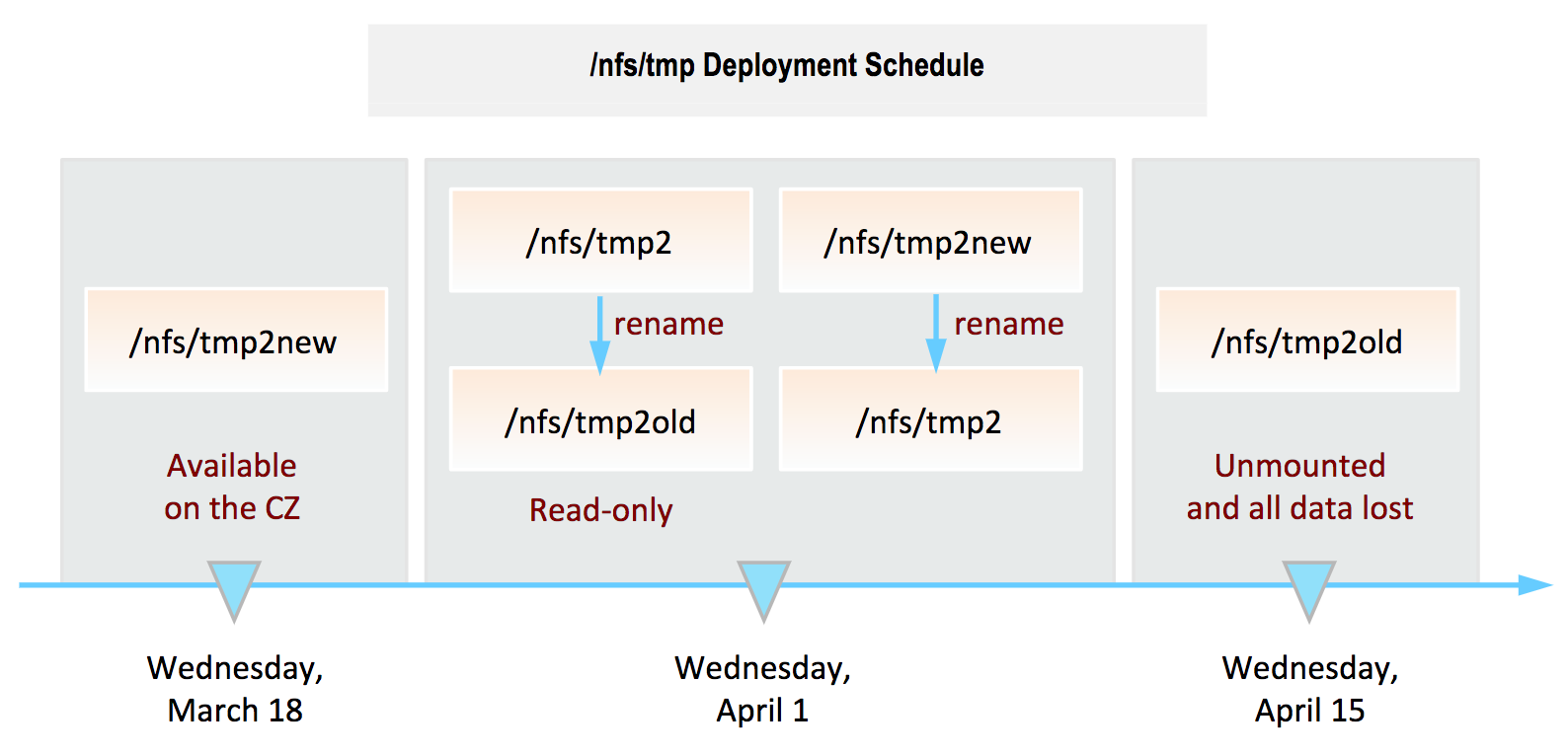 The following outlines the changes to the naming conventions during the deployment period. Please note that four weeks after deploying the new /nfs/tmp2 file system, LC will retire the existing /nfs/tmp2 file system on the CZ.