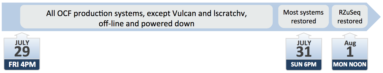 | July 29 | 4 PM | All* Open Computing Facility (OCF) production systems taken off-line and powered down. Running jobs will be canceled, but queued jobs should not be lost. |